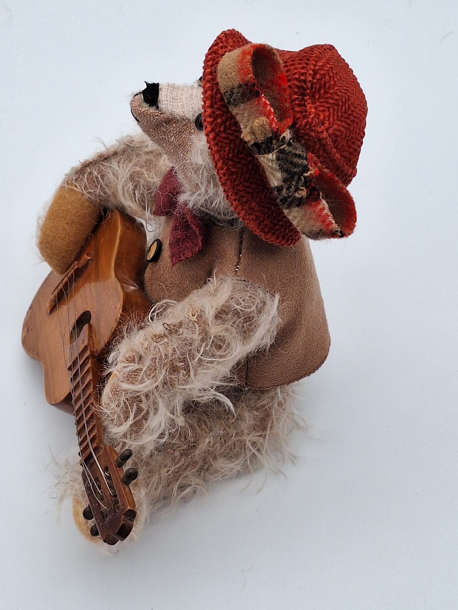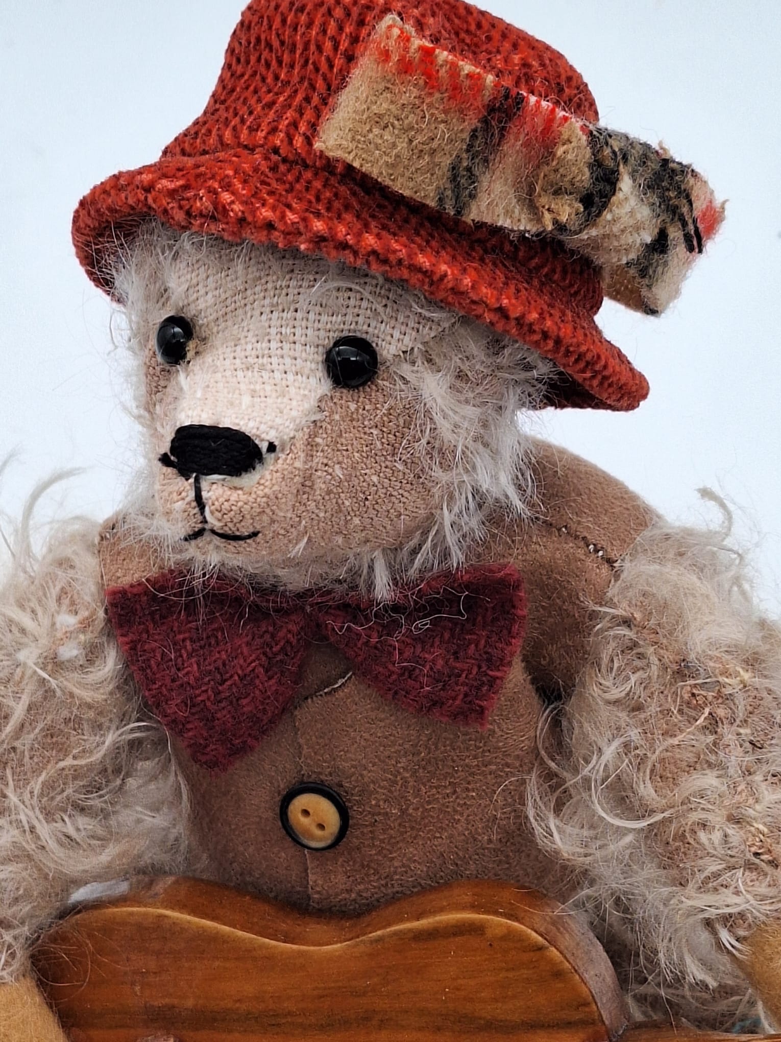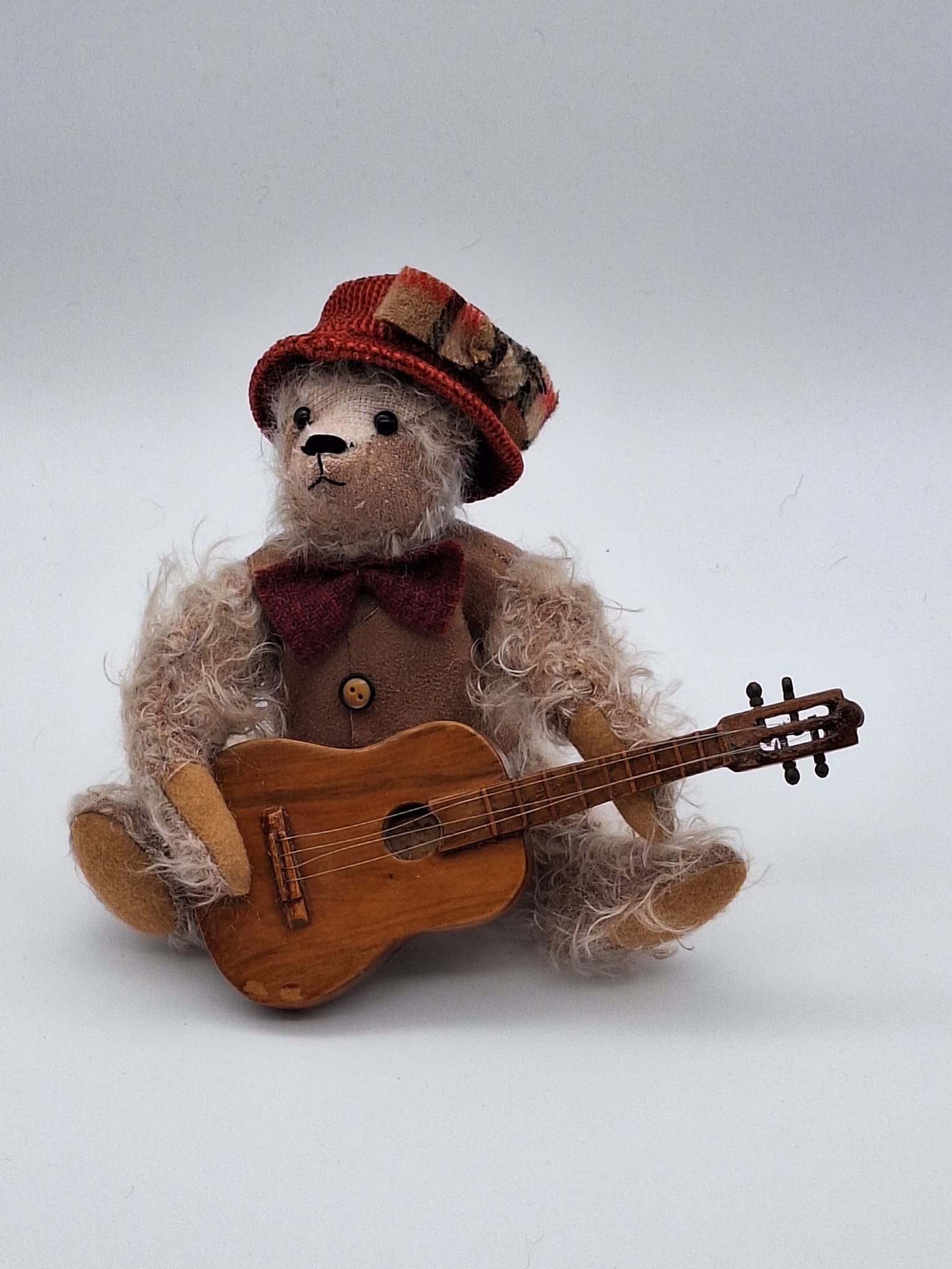 Je m’appelle BALTAZAR. Je suis confectionné dans une fourrure Mohair Steiff Schulte couleur beige clair. J’ai de jolis yeux en verre noirs. J’aime la musique. Je donne des cours de guitare et je fais également des concerts. Mes bras, jambes et tête articulés, m’offrent la possibilité de me mettre dans différentes positions.