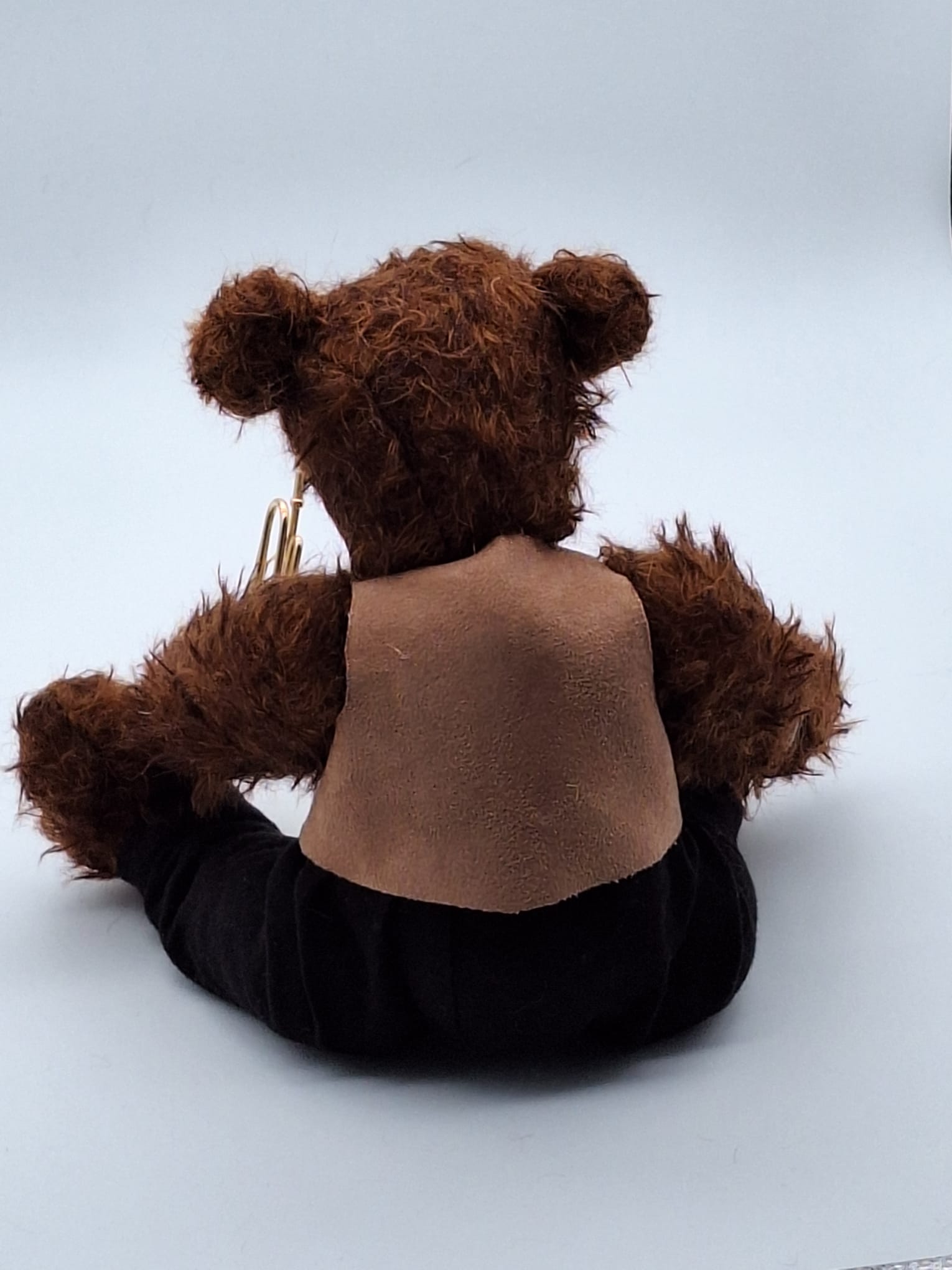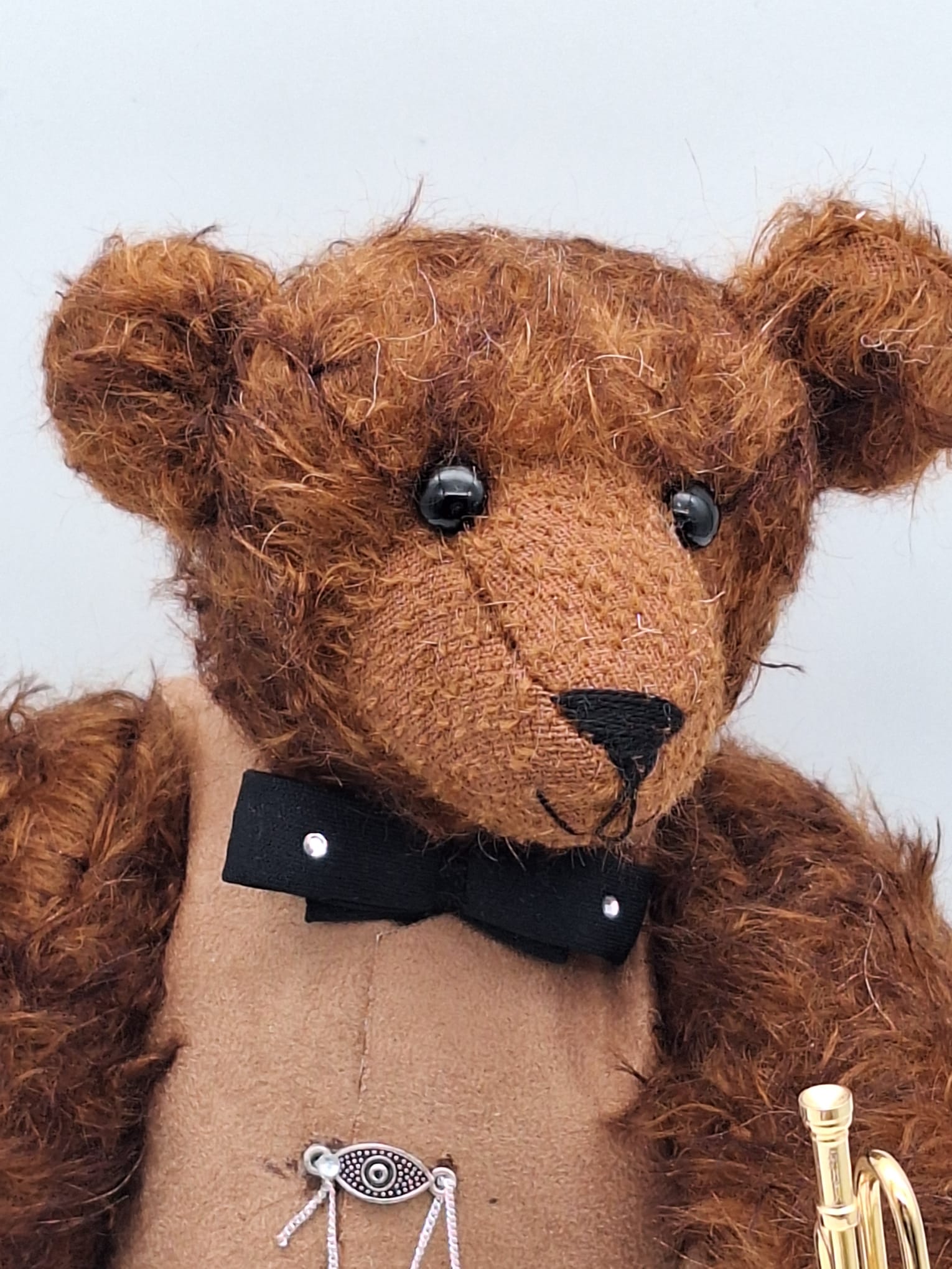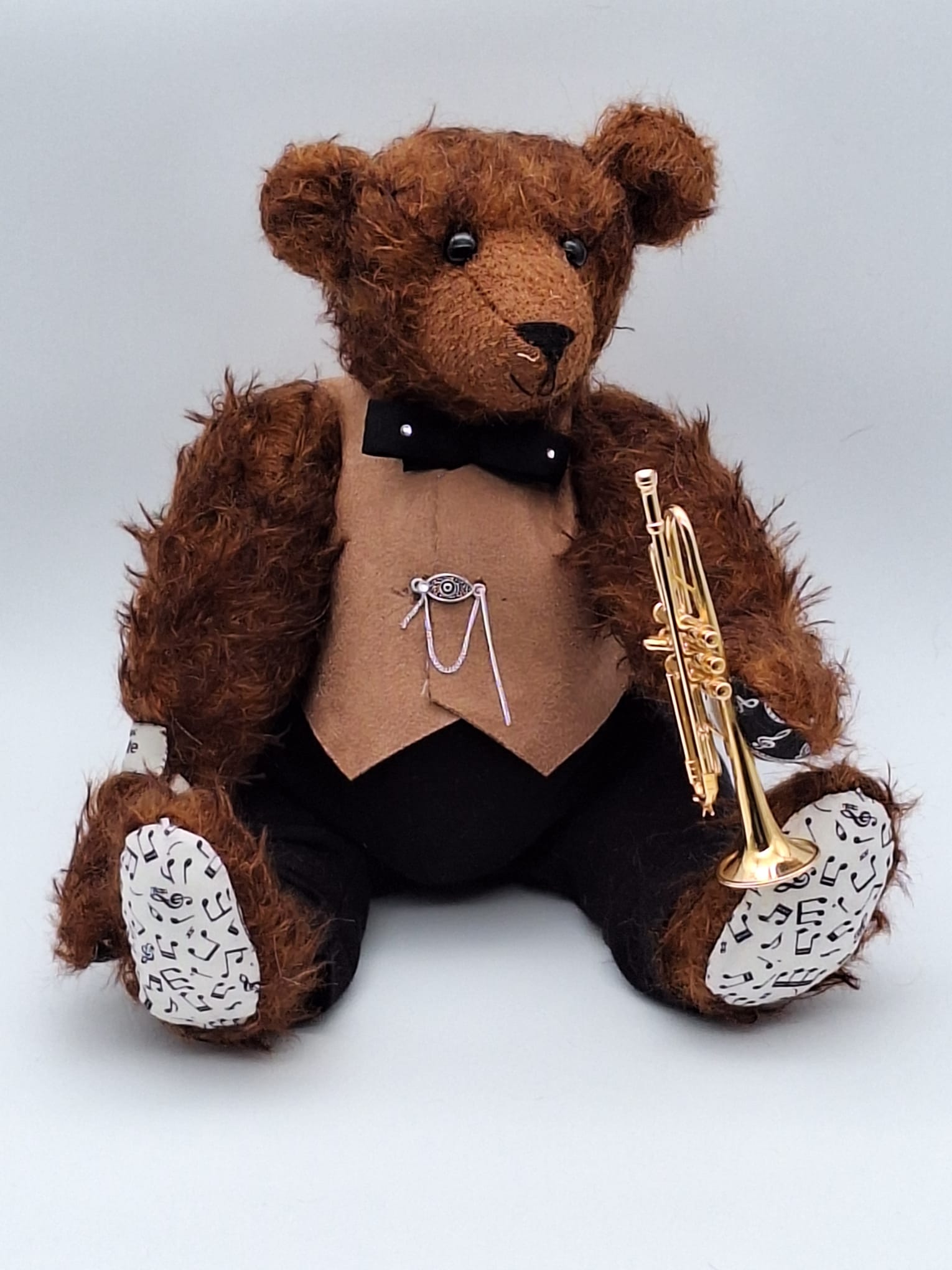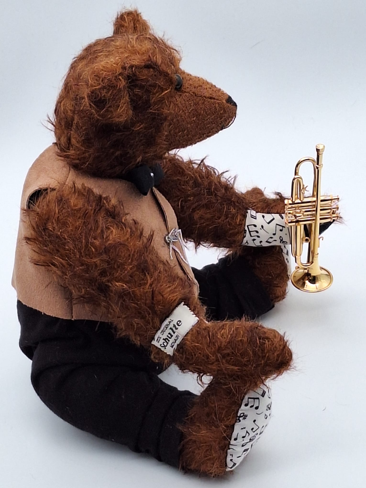 Je m’appelle GEORGES. Je suis confectionné dans une fourrure Mohair Steiff Schulte couleur marron foncé. J’ai de jolis yeux en verre noir. J’aime la musique et je suis un très grand musicien. Ma trompette d’or me suis partout je fais beaucoup de concert dans le monde entier. Mes bras, jambes et tête articulés, m’offrent la possibilité de me mettre dans différentes positions.