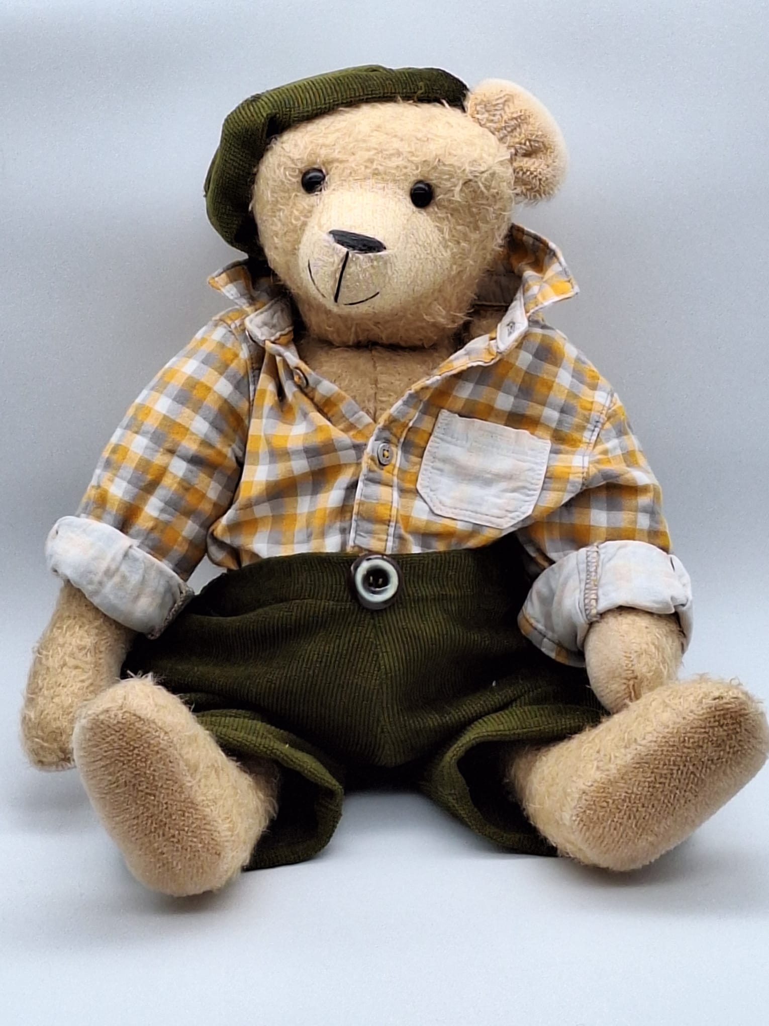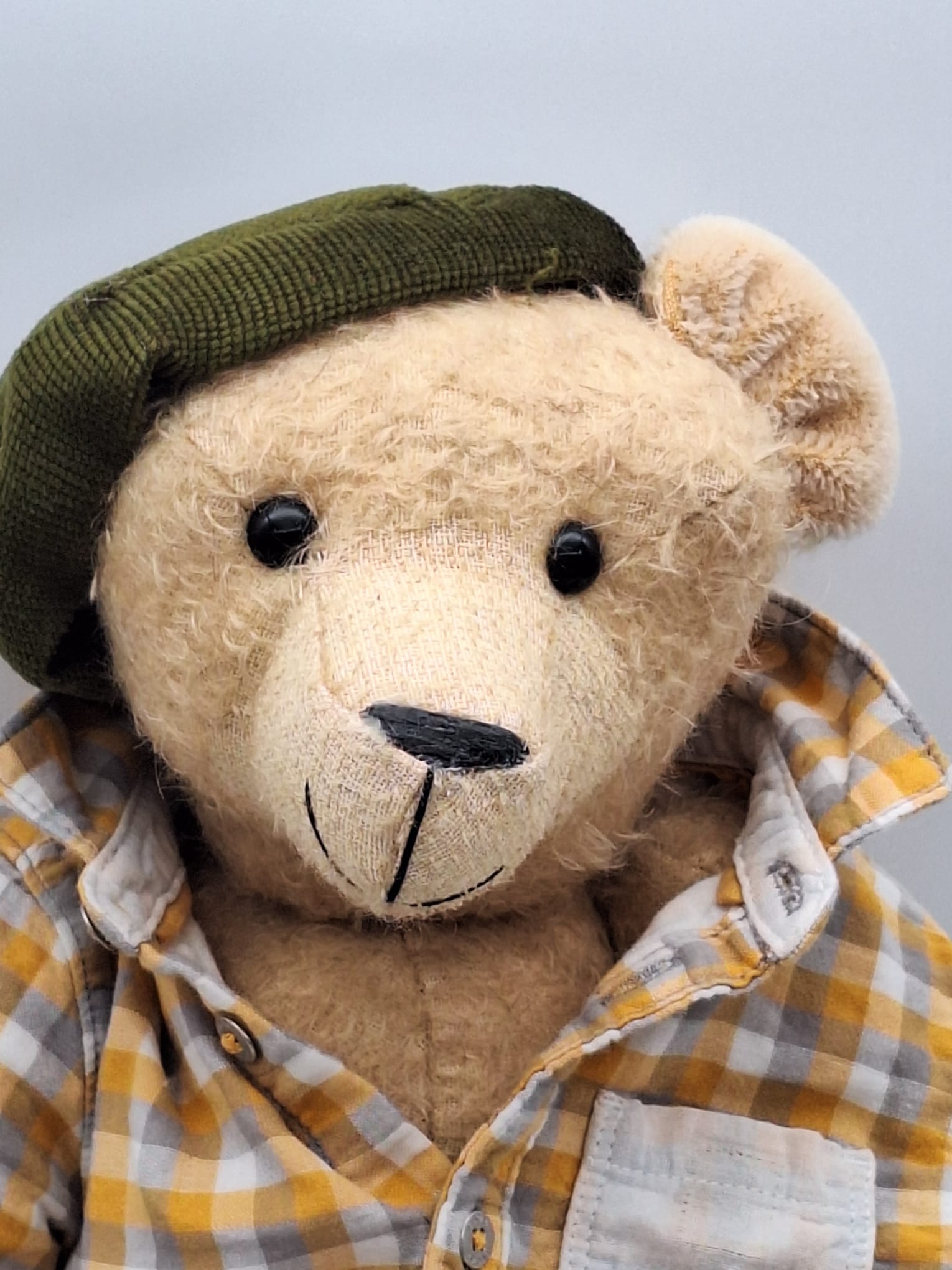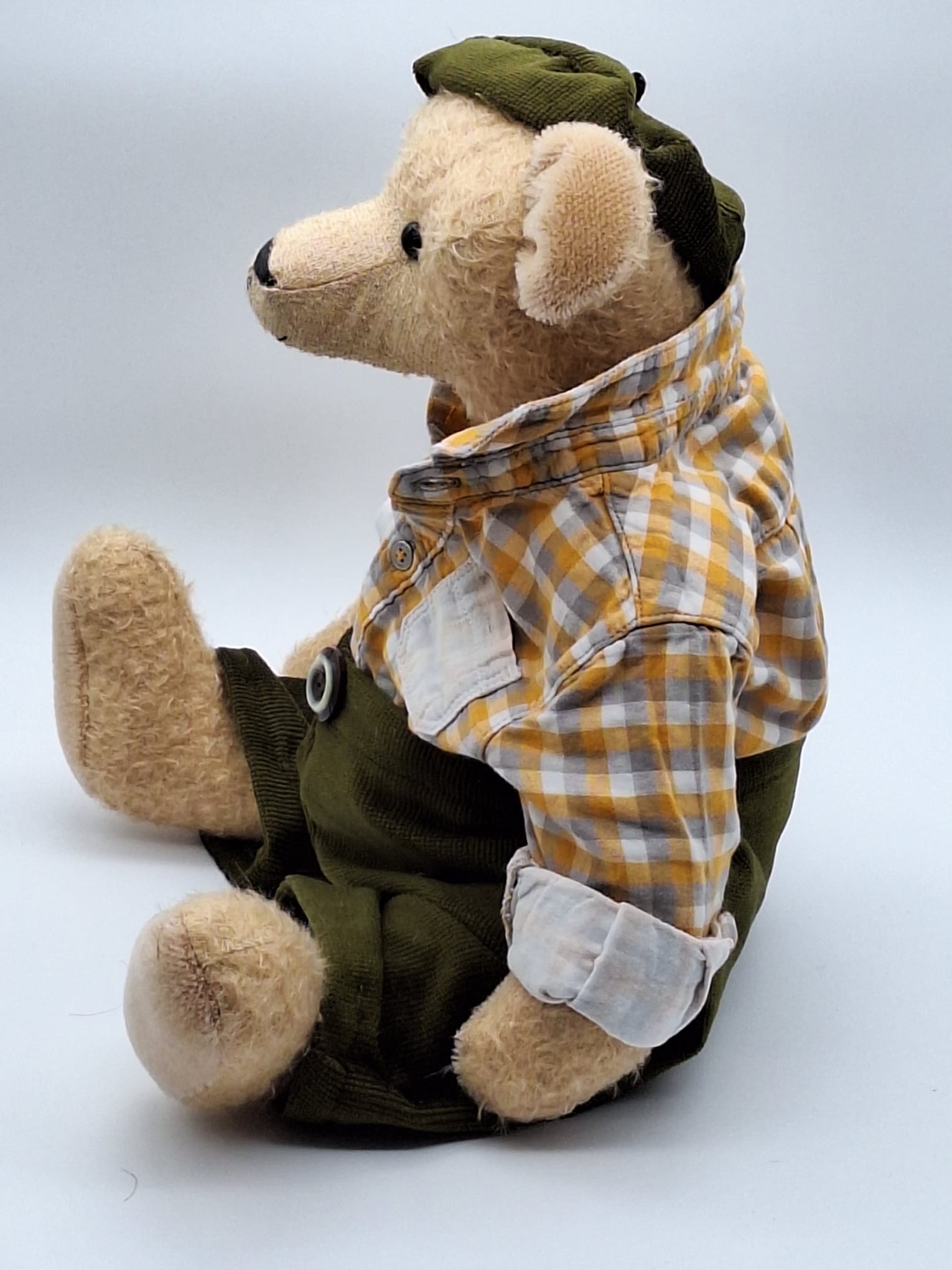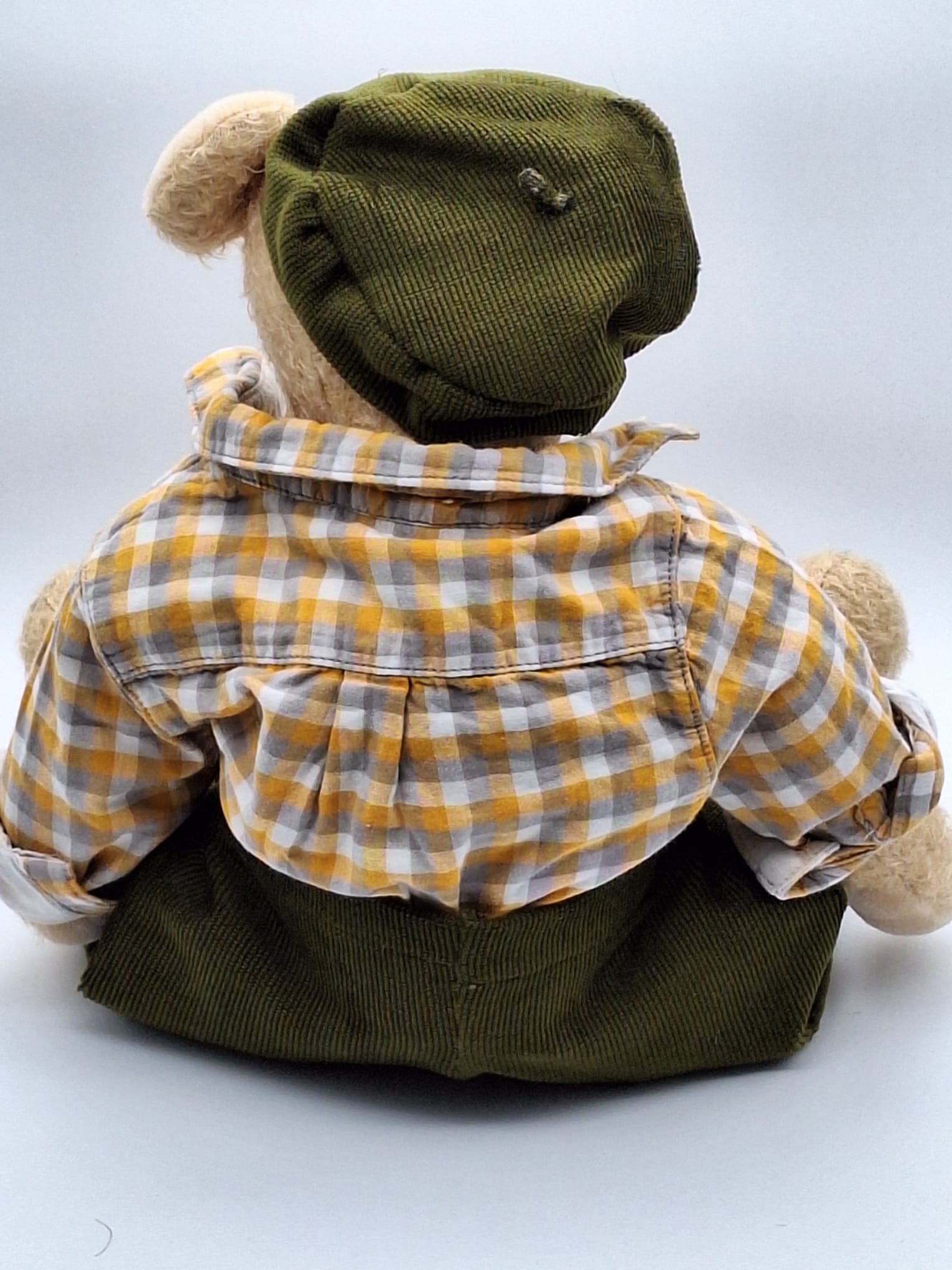 Je m’appelle GERARD ! Je suis confectionné dans une fourrure mohair Steiff Schulte beige clair. Aujourd’hui il fait très beau et je profite pour aller faire une petite promenade. Pour cela j’ai mis casquette assortie à mon pantalon. Je suis un nounours très gentil qui aime la vie. Mes