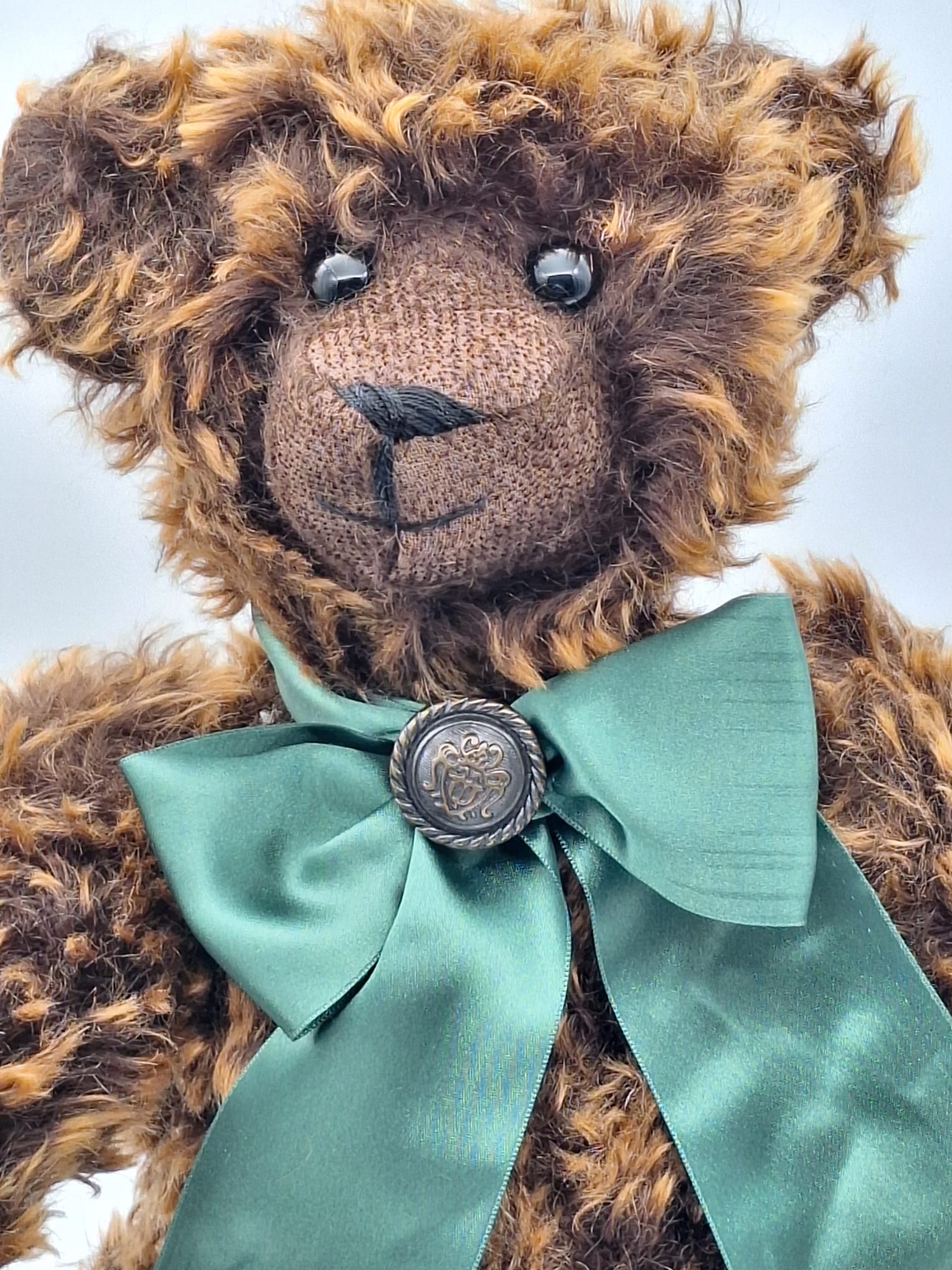 Je m’appelle GIGI. Je suis confectionné dans une fourrure mohair très douce Steiff Schultecouleur marron foncé et or. Je vis au cœur d’une grande forêt de sapins au Canada. J’ai un pelage doux comme une couverture d’hiver et tous les matins je fais le tour de ma clairière pour saluer mes amis car je suis grand et fort mais avec un cœur immense. Désormais on ne dit plus attention un grizzly mais coucou voici GIGI notre gentil ami. Mes bras, jambes et tête articulés, offrent la possibilité de me mettre dans différentes positions.