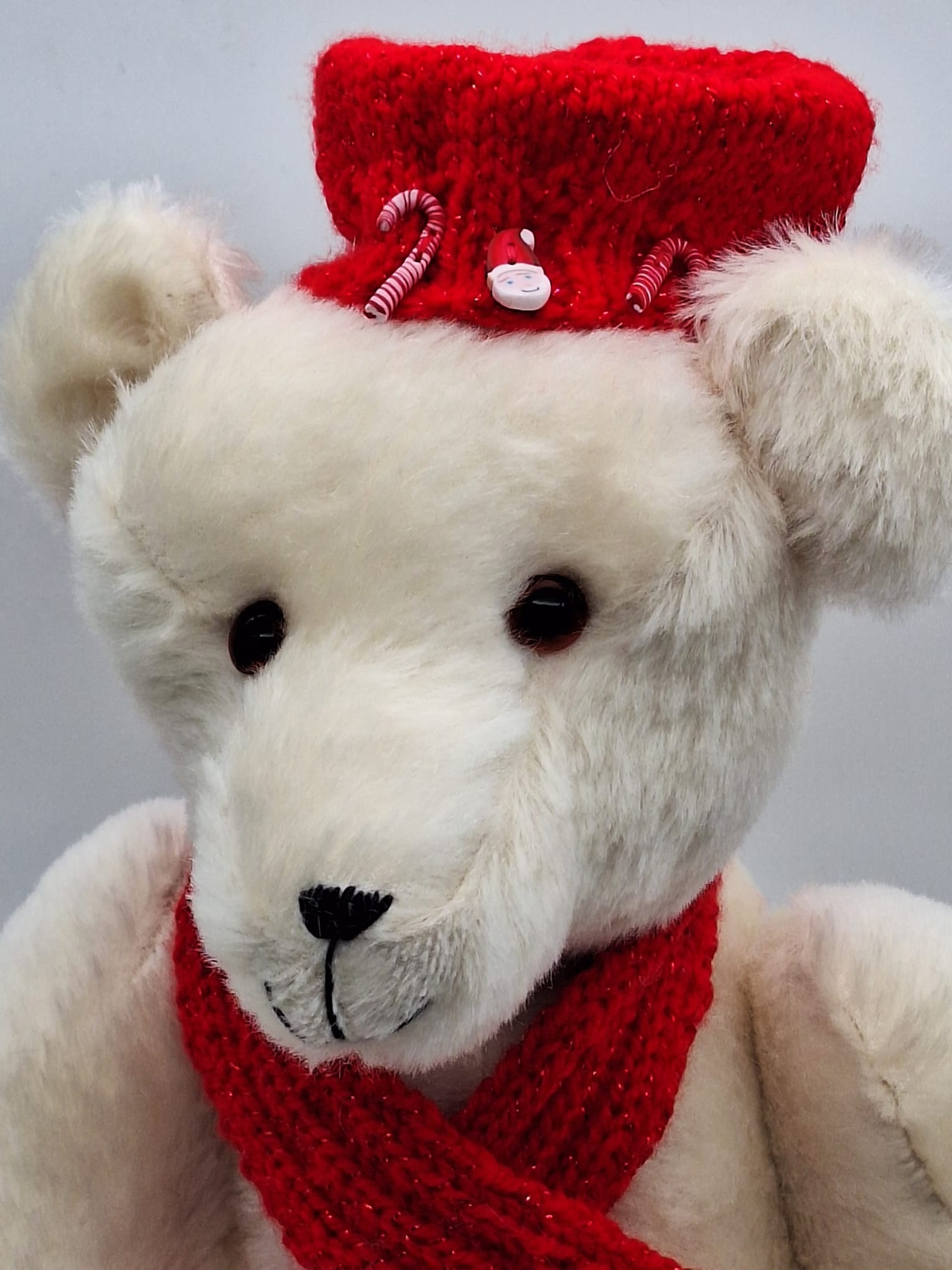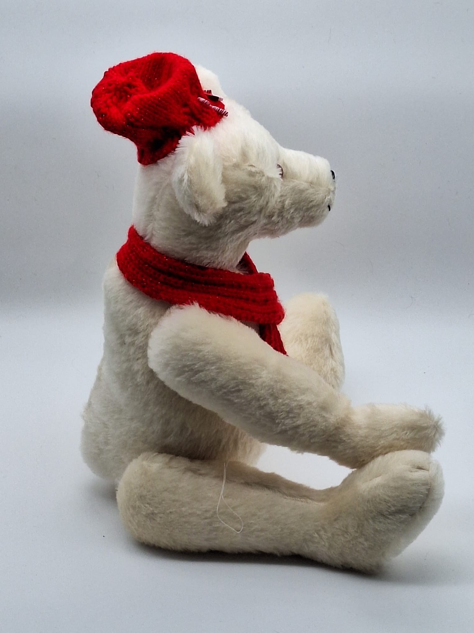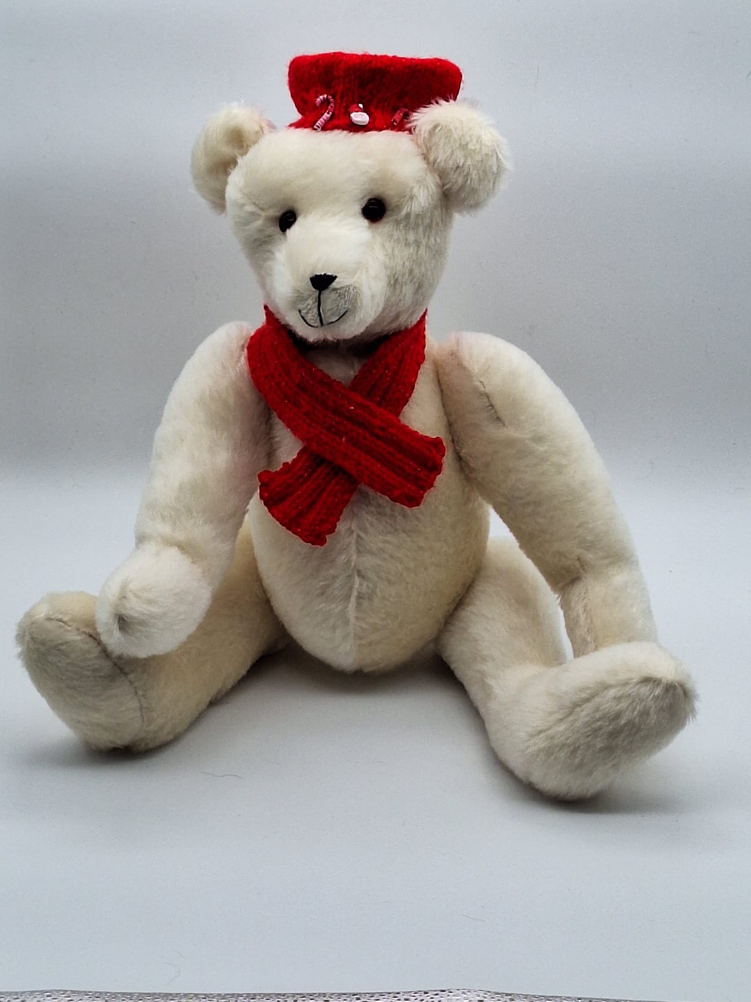 Je m’appelle JOEL. Je suis confectionné dans une fourrure mohair super douce Steiff Schulte couleur blanc. J’ai de jolis yeux en verre marron et un petit sourire sympa. Noël approche j‘ai mis mon joli bonnet rouge tricoté mains et mes décorations pour les fêtes. Comme il ne fait pas très chaud, j‘ai pris aussi mon cache nez. Mes bras, jambes et tête articulés, m’offrent la possibilité de me mettre dans différentes positions.