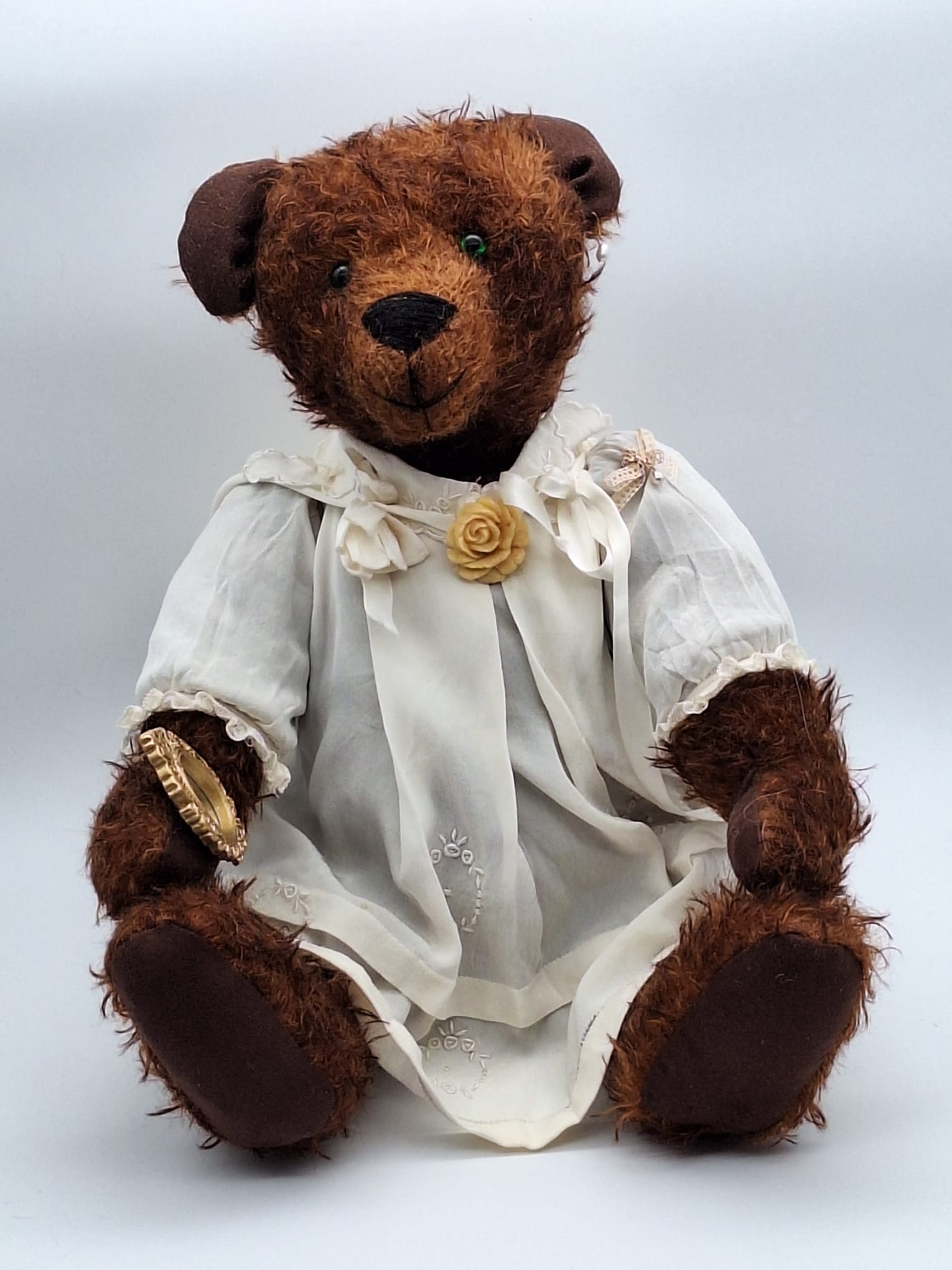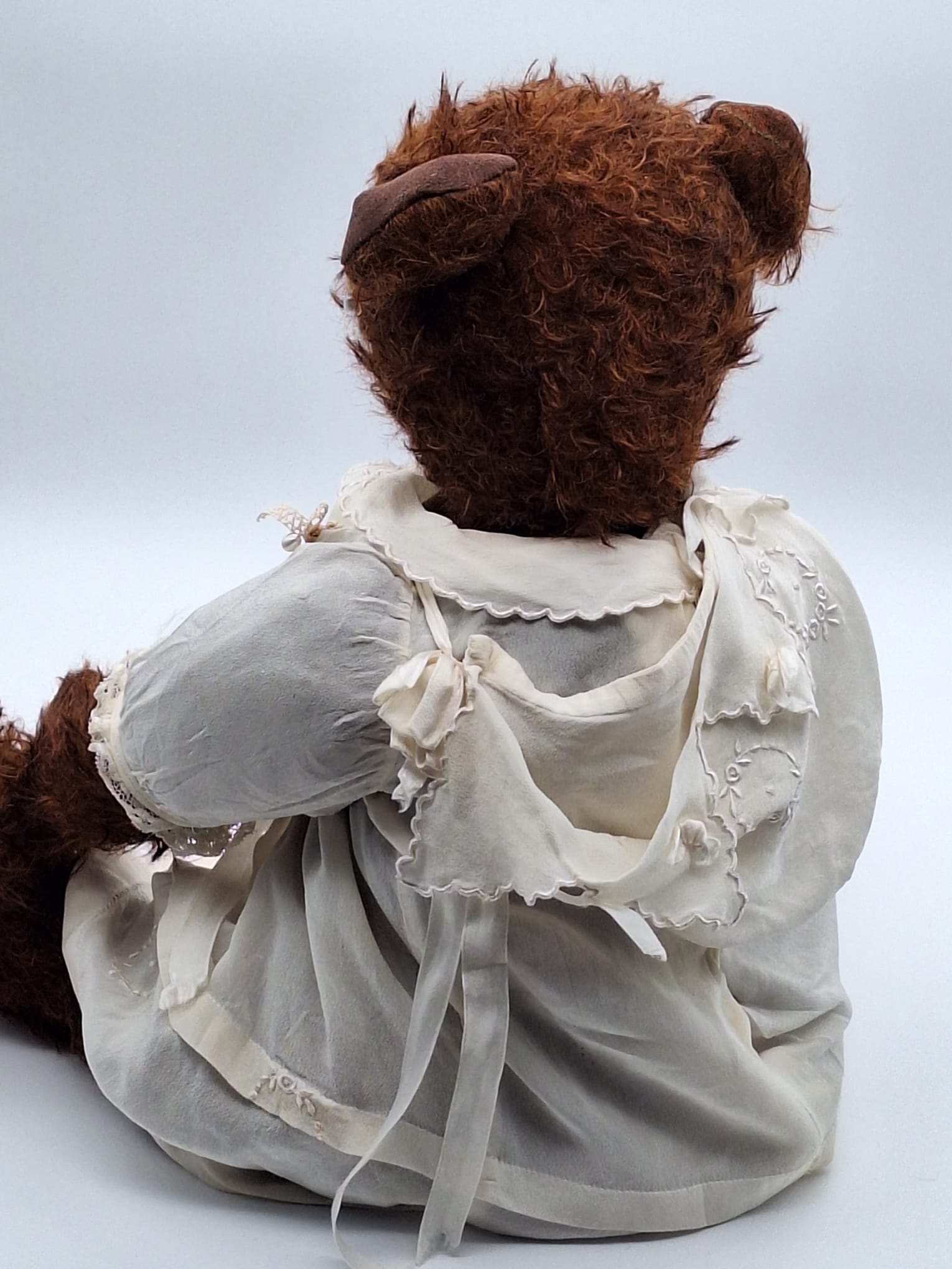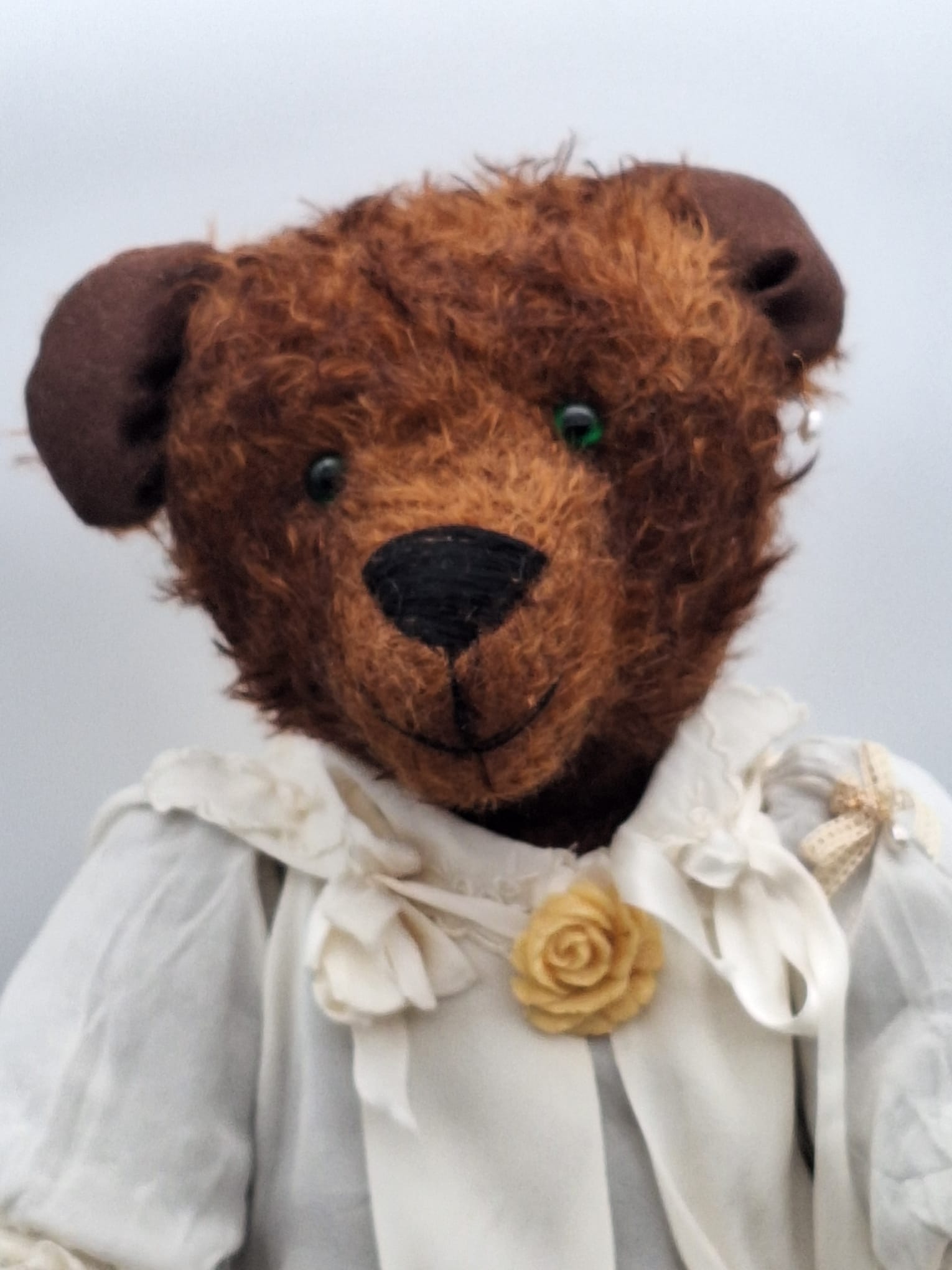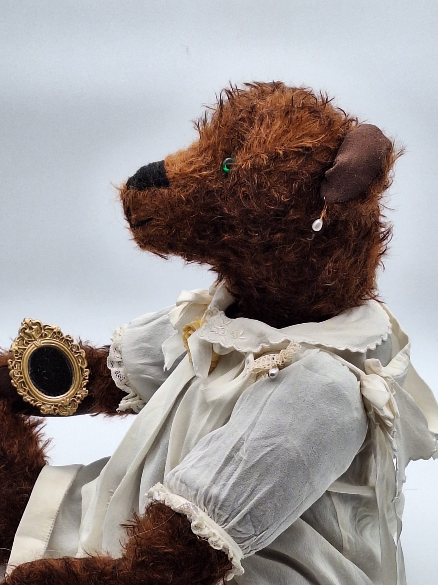 Je m’appelle MIREILLE. Je suis confectionnée dans une fourrure mohair Steiff Schulte marron foncée comme les ours bruns. Je me réveille avec ma nuisette et mon bonnet de nuit que j’ai acheté chez un antiquaire. Devant ma glace je mets mes boucles d’oreille et déjà j’ai le sourire du matin. Mes yeux en verre ronds et brillants, me donnent une expression douce et pleine de caractère. Mes bras, jambes et tête articulés, m’offrent la possibilité de me mettre dans différentes positions.