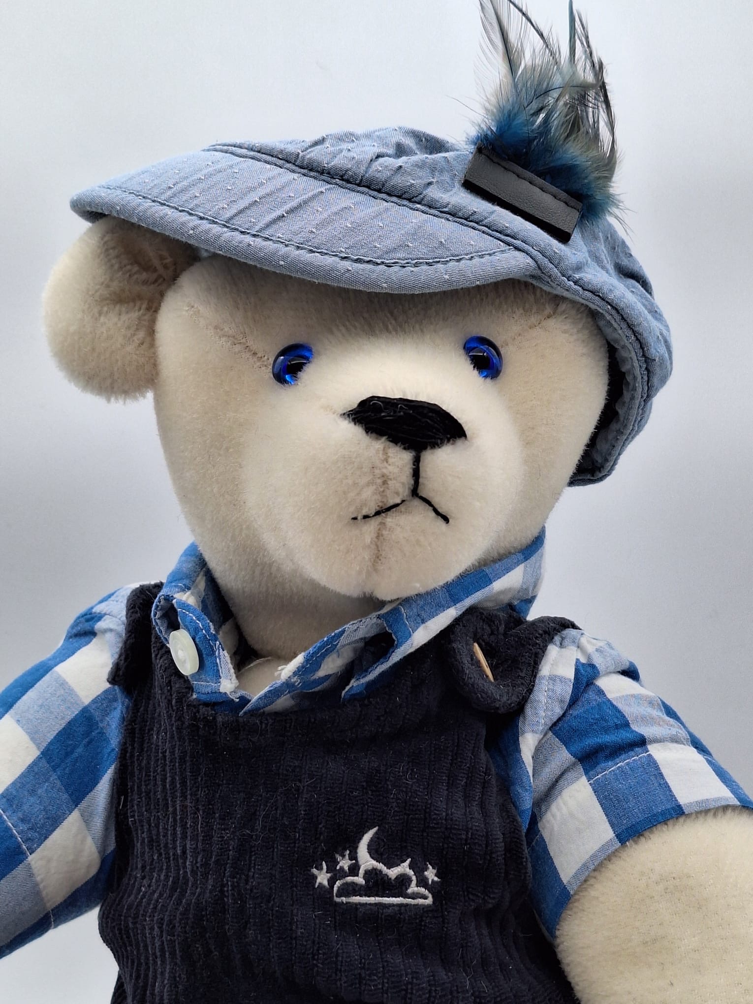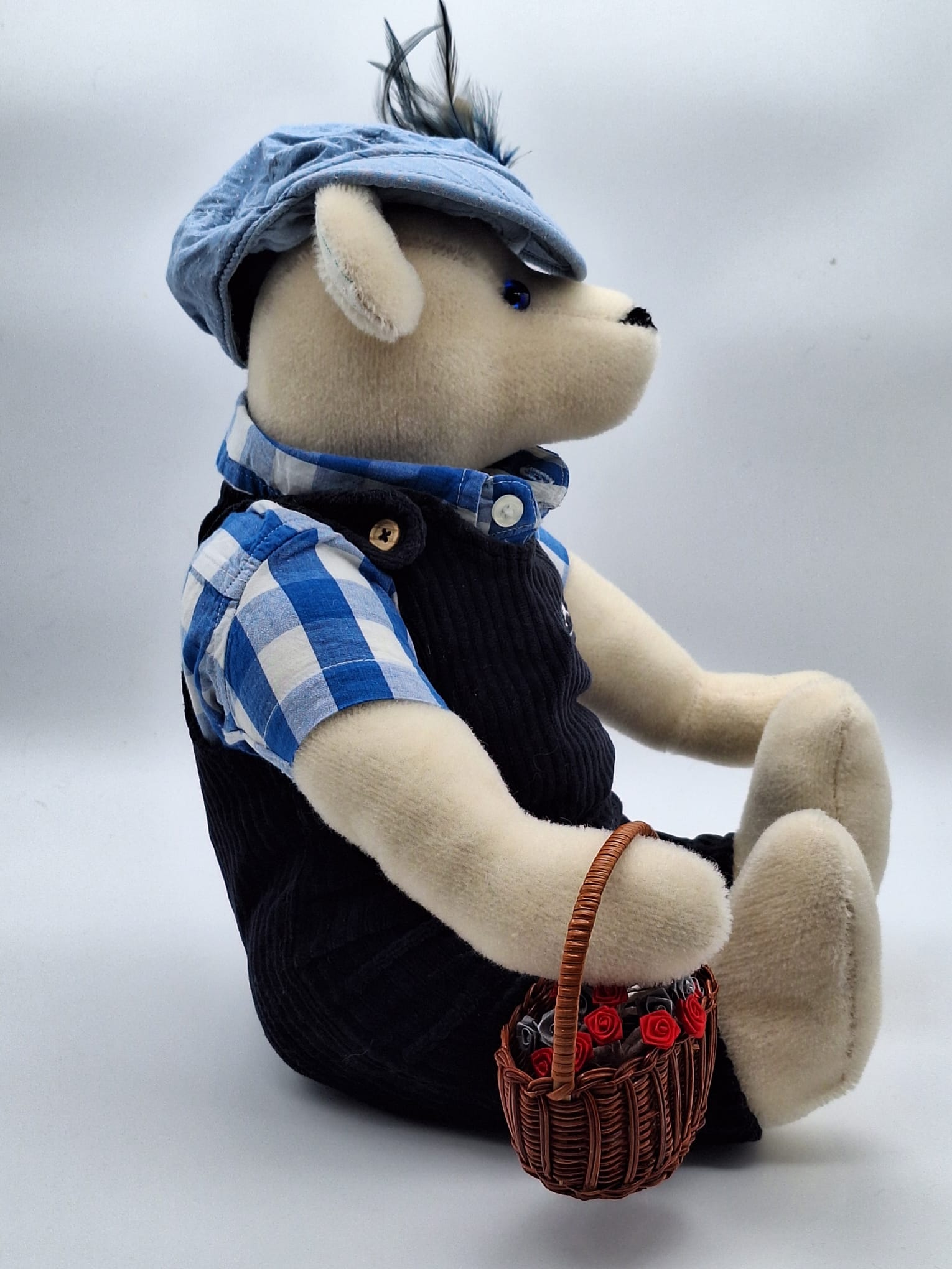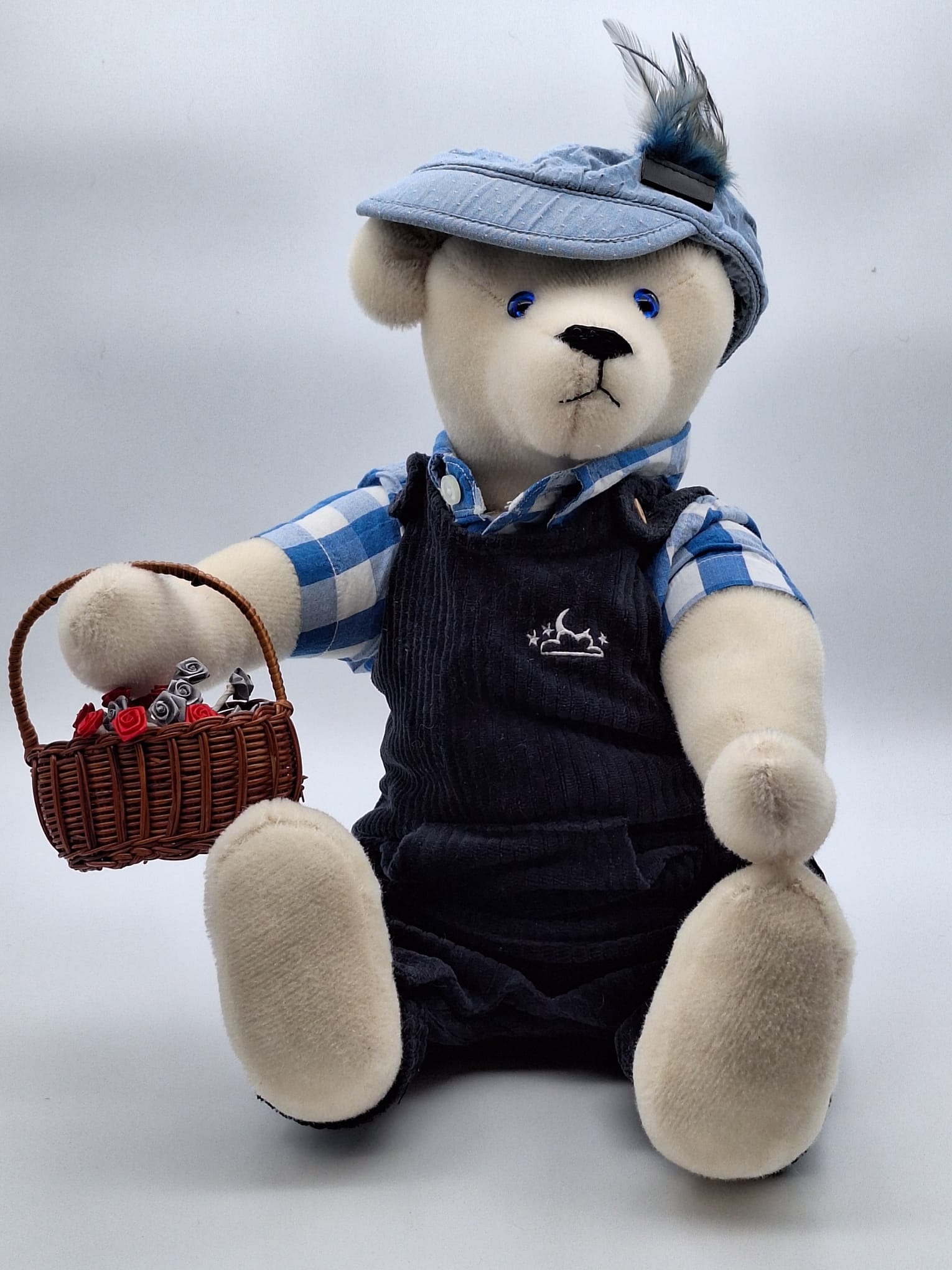 Je m’appelle SATURNIN. Je suis confectionné dans une fourrure mohair Steiff Schultecouleur blanche.  J’ai de jolis yeux en verre bleus. Je suis un jardinier heureux, avec mes fleurs c’est le bonheur. Je j’ai cueilli un joli bouquet pour l’offrir à ma fiancée. Mes bras, jambes et tête articulés, m’offrent la possibilité de me mettre dans différentes positions.